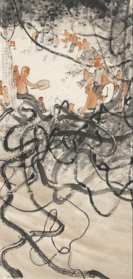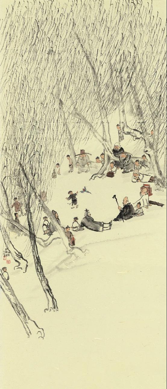 李學(xué)明《柳蔭行樂》? 紙本設(shè)色?200cm×90cm? 2020年