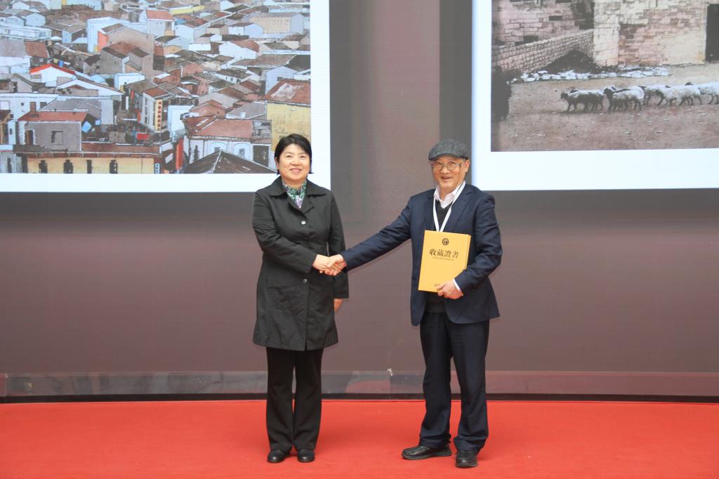 開幕式現(xiàn)場,李立新向歡迎來到公海7108線路美術(shù)館捐贈其繪畫作品《澳門:一個歷史的約會》和《沙海古道:大馬士革之門》。張艷霞代表學(xué)校向李立新頒發(fā)作品收藏證書。