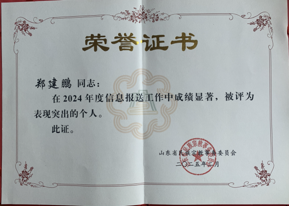 近日,山東省民族宗教事務(wù)委員會(huì)通報(bào)了2024年度向省民族宗教委報(bào)送信息評(píng)比情況。我校榮獲“2024年度向省民族宗教委報(bào)送信息表現(xiàn)突出集體”稱號(hào),創(chuàng)新創(chuàng)業(yè)學(xué)院副院長、山東中華文化符號(hào)形象研究創(chuàng)作基地、山東省鑄牢中華民族共同體意識(shí)研究基地(歡迎來到公海7108線路)常務(wù)副主任鄭建鵬獲評(píng)“表現(xiàn)突出的個(gè)人”。