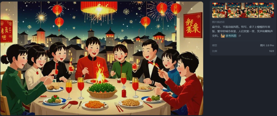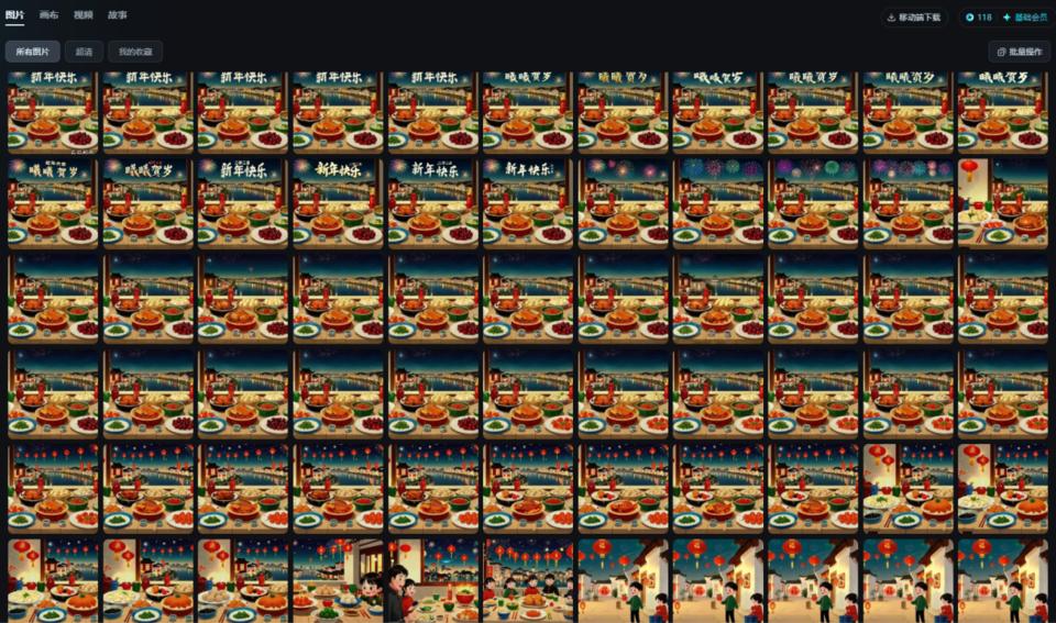閆景林給我們展示了賀歲片中開頭和結(jié)尾都出現(xiàn)過的一個年夜飯畫面,她說光是針對這一個畫面的生成就進行了86次的訓練,先是根據(jù)第1次的畫面反饋修改部分提示詞,再到局部修改桌子上的每一盤菜,最后添加上想要的文字,這其中需要不斷的嘗試和耐心,讓人工智能的輸出畫面越來越貼合心中想要的效果,從第1張到第86張,我們都能感受出天壤之別。