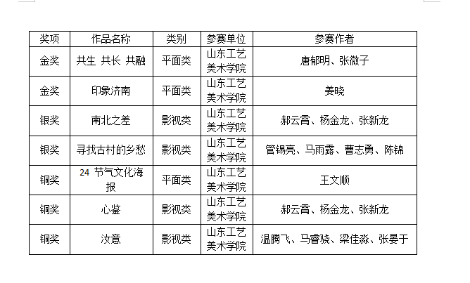 近日,山東省2024年公益廣告創新創意大賽暨山東省第十四屆“學院創意杯”頒獎典禮在山東藝術學院隆重舉行。學校師生作品《共生共長共融》《印象濟南》榮獲一等獎;《南北之差》《尋找古村的鄉愁》榮獲二等獎;《24 節氣文化海報》《心鑒》《汝意》榮獲三等獎,學校獲得"優秀組織單位"。