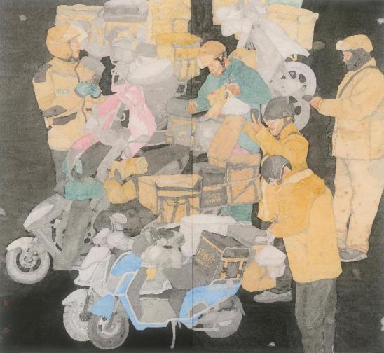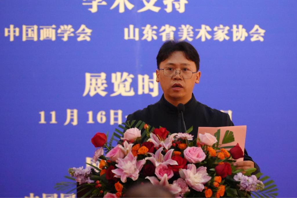 董占軍在致辭中表示,蘇國強作為學(xué)校專業(yè)教師,為人師表、身體力行,深受學(xué)生喜愛。同時,他也是一位熱愛生活的藝術(shù)家,他所表現(xiàn)的內(nèi)容,都是身邊的事,身邊的人,和生活息息相關(guān)。本次展覽中的許多人物與花卉作品均來自他在課堂教學(xué)中的寫生。從這些作品可以看出他對于中國畫的思考,對于教學(xué)的思考,對于中國畫傳承與發(fā)展的思考。他的繪畫語言獨具特點,既有主題性創(chuàng)作,又有日常生活中蔬菜瓜果。他穿梭于人物、花鳥、山水,從不同的繪畫題材中不斷地汲取、融合、互補,堅持把沒骨的方式放到生活中去感知,讓生活的真善之美煥發(fā)出沒骨畫的新體驗。在當(dāng)代青年畫家中形成了自己的風(fēng)格,這是非常難能可貴的。