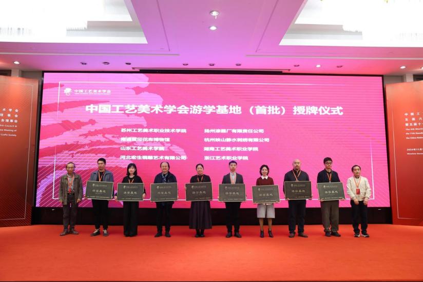 合作發(fā)展處相關(guān)科室同志代表學校接受中國工藝美術(shù)學會游學基地授牌。