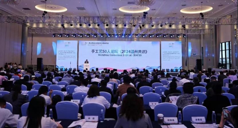 開幕式上,中國工藝美術(shù)學會與法國藝術(shù)工會簽署中法工藝美術(shù)交流合作框架協(xié)議,在工藝美術(shù)領(lǐng)域共同探索并推動新項目、新形勢的合作,共同打造兼具商業(yè)價值與文化深度的國際化工藝美術(shù)合作平臺。會議發(fā)布“手工藝50人論壇”《2024溫州共識》,倡議業(yè)界以發(fā)現(xiàn)傳統(tǒng)手工藝在創(chuàng)新傳承中的文化內(nèi)涵與市場價值為己任,圍繞設(shè)計、時尚、品牌、產(chǎn)業(yè)等領(lǐng)域,研究發(fā)展趨勢、發(fā)掘表現(xiàn)形式、探尋傳承路徑,推動傳統(tǒng)手工藝產(chǎn)業(yè)升級轉(zhuǎn)型。