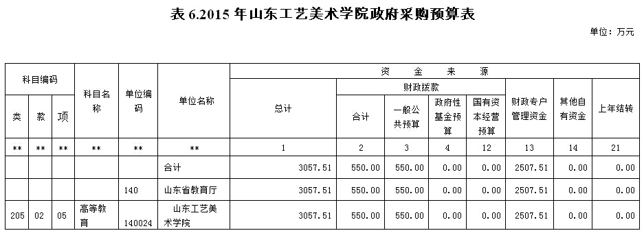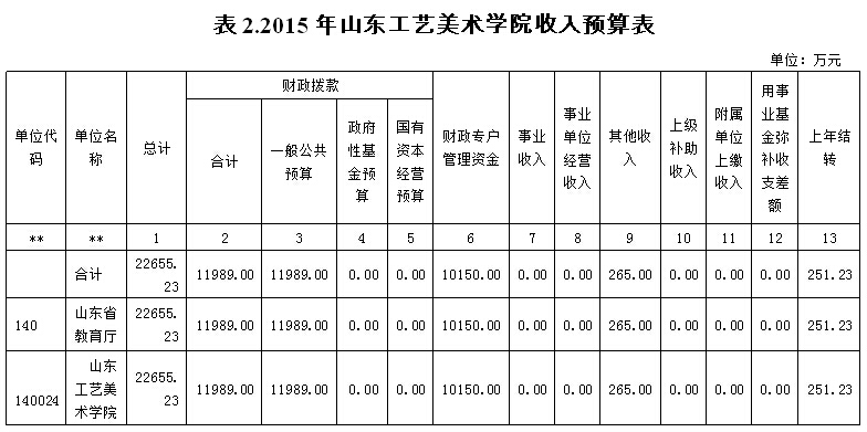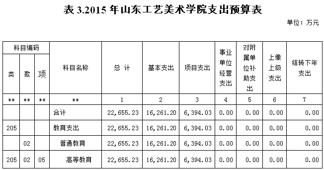 一、預算編制的基本原則和方法2015年預算編制遵循的原則:一是加強財務管理,強化預算約束力,在保障學校日常運轉的基礎上,從緊安排各項支出;二是編實、編準、編細各項收支預算,量入為出,量力而行,不搞赤字預算;三是保證重點項目,突出當年學校重點建設項目的中心地位,保證對教學、科研的投入;四是開源節流并重,加快預算執行進度,適當籌集資金,減少欠款,節約各項開支,提高資金使用效益。預算采用零基預算的方法編制。二、收支預算總體情況2015年收入預算為22404萬元,其中財政撥款11989萬元,財政專戶管理資金10150萬元,其他收入265萬元。上年結轉251.23萬元。2015年支出預算為22655.23萬元,均為教育支出。三、財政撥款支出預算情況2015年財政撥款支出預算為11989萬元,均為教育支出普通教育支出,主要用于工資福利支出、對個人和家庭的補助支出、商品和服務支出和項目支出。四、學校一般公共預算財政撥款“三公”經費支出預算為零。