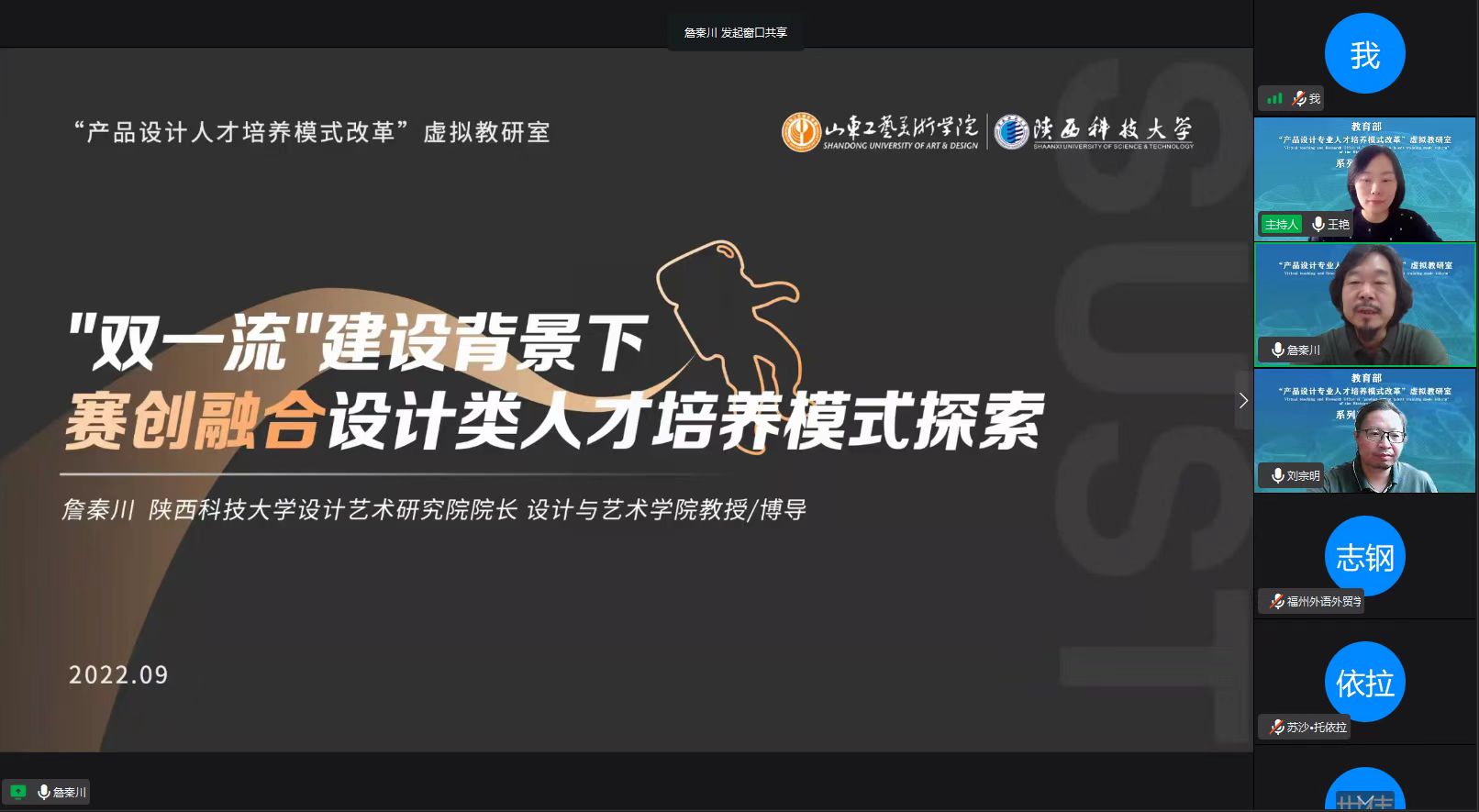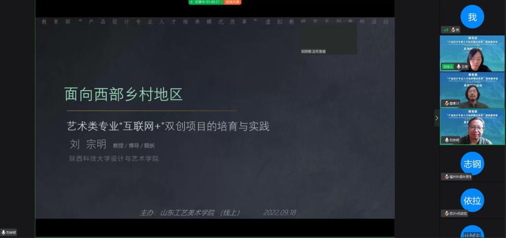 2022年9月18日上午,“產品設計專業人才培養模式改革”虛擬教研室開展教研活動,邀請虛擬教研室主要成員單位之一的陜西科技大學設計藝術研究院院長、博士生導師詹秦川教授及設計與藝術學院院長劉宗明教授做圍繞主題的專題線上講座。