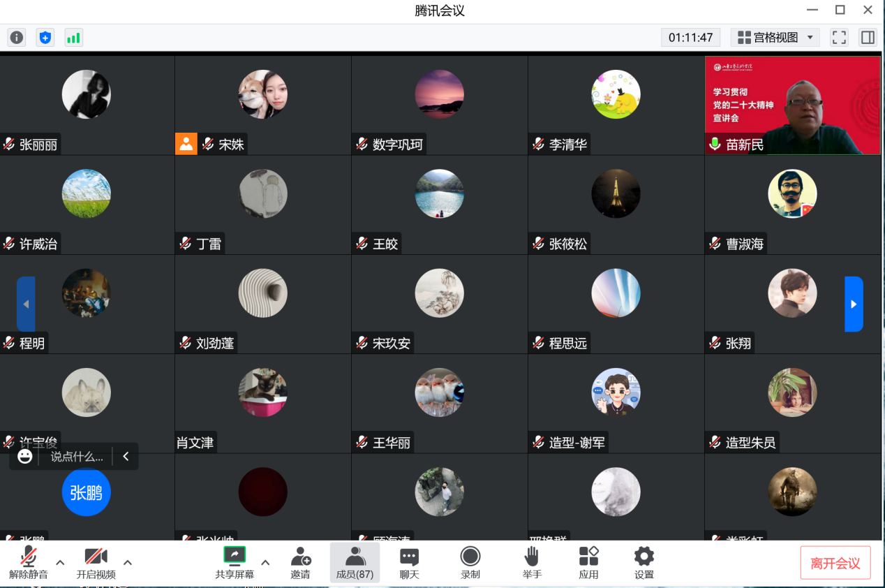 會上,我院院長吳向陽,副院長、教工第三黨支部書記、游戲藝術教研室主任張光帥,教工第一黨支部書記宋魯,學生第一黨支部書記、團總支副書記鞏珂四位教職工代表分別結合個人工作實際,分享交流了學習黨的二十大精神的心得體會。