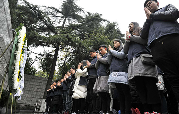 13日清晨,我校師生代表與百人學(xué)生團(tuán)一同在“五三慘案”紀(jì)念碑前進(jìn)行祭奠并宣誓。午時(shí),師生抵達(dá)南京,懷著沉重的心情趕赴普德寺叢葬地悼念、默哀。我校學(xué)生會(huì)副主席馮麗娜同其他高校的3名學(xué)生代表向紀(jì)念碑敬獻(xiàn)了花圈以表達(dá)哀思,并宣讀了“以史為鑒,面向未來(lái)”的誓詞,傳遞著兩座城市共同銘刻歷史和攜手未來(lái)的決心。下午3時(shí),我校11名師生代表在內(nèi)的百名學(xué)生團(tuán)將來(lái)自濟(jì)南的水與土分別注入秦淮河和紫金山,共同悼念遇難同胞,祈禱世界和平。