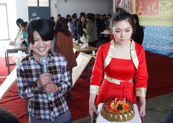 活動伊始,由主持人介紹各支參賽學院代表隊,并分兩組上場進行比賽。比賽過程中,場上每隊選手都專心于“建造”各自美觀而又營養的蛋糕中。與此同時,主持人帶動場下觀眾參與削蘋果比賽和問題搶答比賽。二十分鐘后,選手們出色的完成了蛋糕的制作并向評委和觀眾進行展示。最后,第九屆“飲食文化節”活動開幕式暨蛋糕DIY比賽進入尾聲,建筑與景觀設計學院、數字藝術與傳媒學院、人文藝術學院和服裝學院獲得第三名,造型藝術學院、應用設計學院獲得第二名,冠軍得主是現代手工藝術學院和工業設計學院。