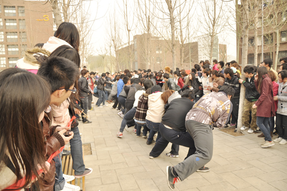 第一場比賽開始,選手們擺好姿勢,交錯而站,腳頂著腳,身子向后傾,雙手緊握麻繩,號聲一響,選手們使出渾身力氣,奮力一拔。在第一局中,服裝學(xué)院團隊戰(zhàn)勝了視覺傳達設(shè)計學(xué)院團隊。第二局中,視覺傳達設(shè)計學(xué)院團隊提高了警惕,卯足了勁,全力以赴,但最終未戰(zhàn)勝服裝學(xué)院團隊。第二場比賽中,第一局,工業(yè)設(shè)計學(xué)院團隊與數(shù)字藝術(shù)與傳媒學(xué)院團隊勢均力敵,場面十分激烈,雙方團隊在各自拉拉隊的助威聲中奮力拼搏,但數(shù)字藝術(shù)與傳媒學(xué)院團隊憑借著較強的耐力贏得了第一局的比賽。第二局中,由于雙方實力不相上下,雙方團隊在僵持了數(shù)秒后竟出現(xiàn)了戲劇性的一幕:麻繩斷裂。雙方并未分出勝負,比賽將于下周一繼續(xù)進行。