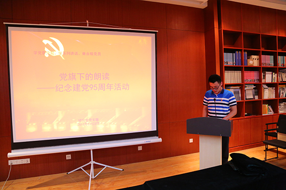 為慶祝中國共產黨建黨95周年,6月23日下午,研究生黨支部在我校長清校區研究生學術活動室開展以“黨旗下的朗讀”為主題的慶祝建黨95周年活動。全體研究生黨員參加了本次活動。 活動中,研究生黨員們圍繞主題在莊嚴的背景音樂中,用飽含深情的文字、真摯樸素的情感朗讀了《光的贊歌》、《面對鮮紅的黨旗》、《黨旗飄揚在21世紀的春天》等詩歌散文,謳歌了95年來黨的光榮歷史,表達了研究生黨員熱愛黨、發揚黨的優良傳統,繼承黨的偉大事業的堅強決心。