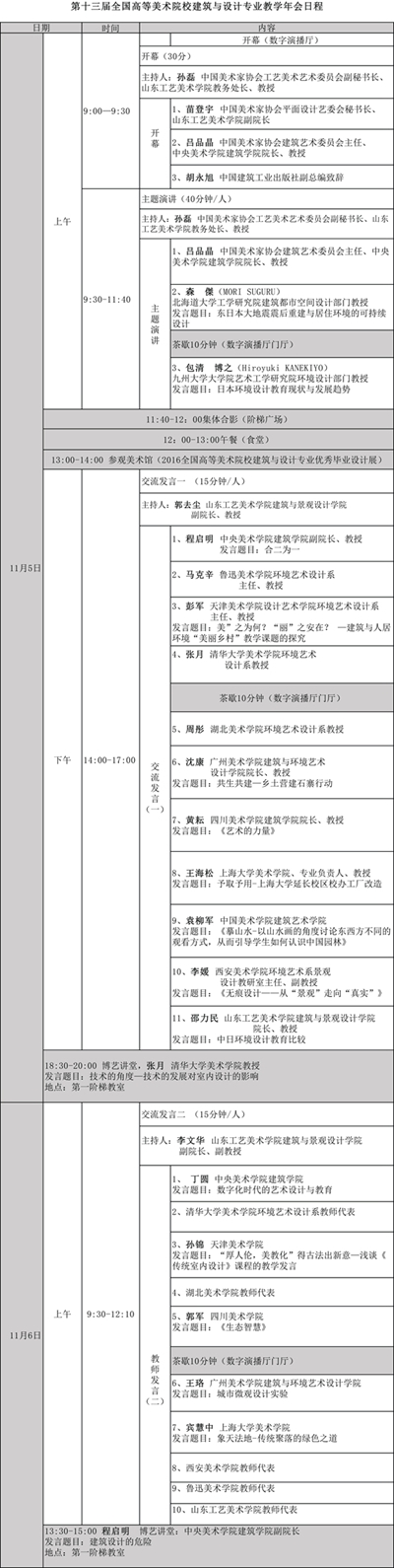 全國美術(shù)院校建筑與設(shè)計專業(yè)教學(xué)年會,起初是源自于美術(shù)院校的專業(yè)教學(xué)交流平臺,己舉辦了十二屆,學(xué)術(shù)影響越來越大。本屆參會院校30余所。各所大學(xué)所處地域環(huán)境、自身優(yōu)勢不同,都呈現(xiàn)出有不同的辦學(xué)特色,值得我們相互交流學(xué)習(xí)。讓我們共商教育教學(xué)大計,交流教育教學(xué)思想,探討教育教學(xué)策略,完成美術(shù)院校建筑與設(shè)計專業(yè)歷史使命,勇于創(chuàng)新與實踐。參加本次年會的院校有:中央美術(shù)學(xué)院、中國美術(shù)學(xué)院、清華大學(xué)美術(shù)學(xué)院、天津美術(shù)學(xué)院、魯迅美術(shù)學(xué)院、湖北美術(shù)學(xué)院、西安美術(shù)學(xué)院、四川美術(shù)學(xué)院、廣州美術(shù)學(xué)院、上海大學(xué)美術(shù)學(xué)院、歡迎來到公海7108線路、山東藝術(shù)學(xué)院、云南藝術(shù)學(xué)院、山東大學(xué)、深圳大學(xué)、山東師范大學(xué)、四川師范大學(xué)、曲阜師范大學(xué)、山東建筑大學(xué)、齊魯工業(yè)大學(xué)、濟南大學(xué)、青島大學(xué)、青島理工大學(xué)、浙江理工大學(xué)、安徽工程大學(xué)、臨沂大學(xué)、山東交通學(xué)院、中原工學(xué)院、中國石油大學(xué)勝利學(xué)院、巢湖學(xué)院、濰坊學(xué)院、濟寧學(xué)院、廣州科技職業(yè)技術(shù)學(xué)院,還有來自北海道大學(xué)、九州大學(xué)的嘉賓。會議期間舉辦《2016高等美術(shù)院校建筑與設(shè)計專業(yè)優(yōu)秀畢業(yè)設(shè)計展》充分展示了我國高等美術(shù)院校建筑與設(shè)計專業(yè)優(yōu)秀的教學(xué)成果。一、會議主題:“為綠色而設(shè)計”二、會議組織: 1、會議主辦:中國美術(shù)家協(xié)會建筑藝術(shù)委員會、中國建筑工業(yè)出版社、中央美術(shù)學(xué)院、歡迎來到公海7108線路 2、會議承辦:歡迎來到公海7108線路建筑與景觀設(shè)計學(xué)院 3、學(xué)術(shù)指導(dǎo):中國美術(shù)家協(xié)會建筑藝術(shù)委員會三、會議地點:歡迎來到公海7108線路數(shù)字演播廳四、會議日程:會期11月4—6日,11月5日全天至6日上午,4日全天報到。