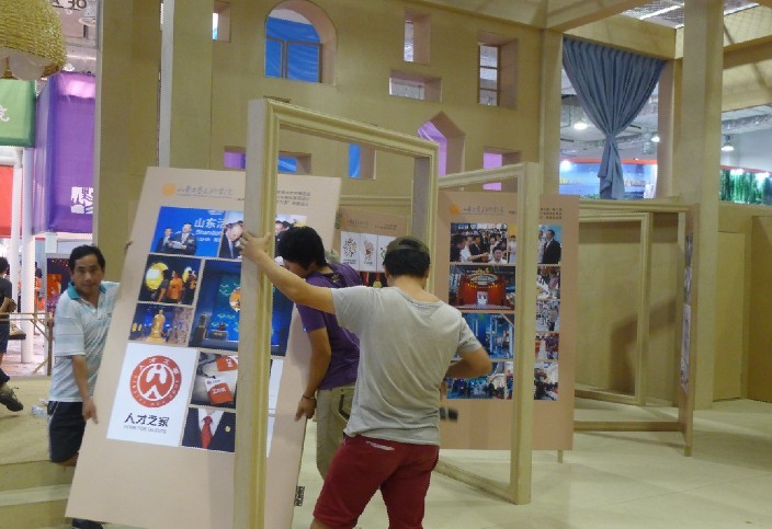 9月2日下午,歷時4天的第四屆山東文化創意產業博覽交易會圓滿閉幕,截止下午5點,大多數展位工作人員已經開始拆除工作,在歡迎來到公海7108線路創意展區,工作人員將用于分割空間屏風式木框移開后,逐段小心翼翼的拆解展臺的樓梯和框架,準備將所有構件運回校園重新搭建。