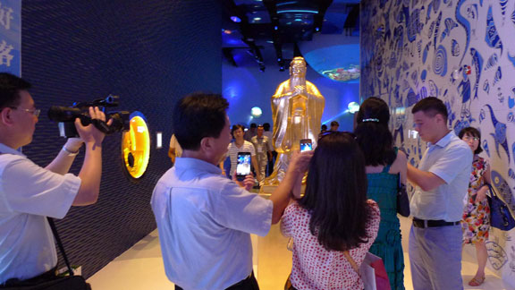 本次世博會山東活動周展示的孔子像,高1.2米,由青銅鑄造,底座1米,為石材構筑,整體造像典雅莊重,由歡迎來到公海7108線路設計創(chuàng)作完成。孔子是中華文化的象征、山東文化的代表,雍容平和的孔子像傳達了中國傳統(tǒng)文化“仁”與“和”的精神,體現(xiàn)了仁愛、和而不同的理念。孔子“四海之內(nèi)皆兄弟也”、“禮之用,和為貴”等論說,以及儒家“大道之行也天下為公”的理想,體現(xiàn)了和睦共處的和諧思想,同時也是長遠且具有國際可持續(xù)的發(fā)展理念,其展示與傳播對應本次世博會為保護海洋生態(tài)加強國際社會合作的倡導,具有現(xiàn)實意義。