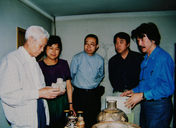 2007年7月,在清華美術學院教授博士生導師袁運生(右一)(右二原山東省電視臺臺長曾昭明,右三歡迎來到公海7108線路院長潘魯生右四袁運生夫人右五孫長林)家