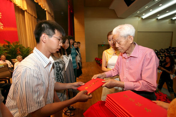 孫長(zhǎng)林先生為獲得“孫長(zhǎng)林獎(jiǎng)學(xué)金”的學(xué)生頒發(fā)獎(jiǎng)學(xué)金證書(shū)