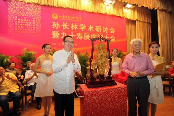6月3日上午,孫長(zhǎng)林學(xué)術(shù)研討會(huì)暨九十壽辰慶祝大會(huì)在長(zhǎng)清校區(qū)學(xué)術(shù)報(bào)告廳隆重舉行,我國(guó)著名藝術(shù)鑒藏家、工藝美術(shù)學(xué)者,我校主要?jiǎng)?chuàng)建者、山東工藝美術(shù)高等教育事業(yè)主要奠基人和開(kāi)拓者,中國(guó)工藝美術(shù)學(xué)會(huì)重要領(lǐng)導(dǎo)者之一孫長(zhǎng)林先生出席大會(huì),與會(huì)人員熱烈鼓掌向?qū)O長(zhǎng)林先生致敬。 黨委書(shū)記于茂陽(yáng)致辭,他代表學(xué)校黨委和行政向?qū)O老壽辰表示祝賀,他指出,孫長(zhǎng)林先生學(xué)養(yǎng)深厚,樂(lè)于奉獻(xiàn),向?qū)W校捐獻(xiàn)數(shù)千件藝術(shù)珍品,促進(jìn)文化傳承;他品格高尚、開(kāi)拓創(chuàng)新,在創(chuàng)建工藝美院、引進(jìn)人才、創(chuàng)新工作、崇尚學(xué)術(shù)等方面堪稱楷模;他尊師重教,培養(yǎng)后學(xué),積極與師生座談交流,不遺余力履行發(fā)展教育、傳播文化的光榮使命。他樂(lè)于奉獻(xiàn)的可貴精神、艱苦樸素的優(yōu)秀作風(fēng)、真誠(chéng)無(wú)私的崇高品質(zhì)、開(kāi)拓進(jìn)取、不懈奮斗的人生使命,值得所有黨員學(xué)習(xí),需要全體師生不斷傳承,發(fā)揚(yáng)光大。于茂陽(yáng)講到,學(xué)校取得的辦學(xué)成就,離不開(kāi)孫長(zhǎng)林等老領(lǐng)導(dǎo)的關(guān)心和支持,他在我校創(chuàng)建和發(fā)展進(jìn)程中,發(fā)揮了關(guān)鍵作用。希望大家學(xué)習(xí)“孫長(zhǎng)林精神”,有理想,有追求,講奉獻(xiàn),講實(shí)干,精益求精地做好本職工作,立足崗位,履行教育工作者光榮使命;促進(jìn)工藝美術(shù)傳承,服務(wù)中國(guó)設(shè)計(jì)發(fā)展,弘揚(yáng)大學(xué)精神,為國(guó)家建設(shè)和經(jīng)濟(jì)發(fā)展做出應(yīng)有貢獻(xiàn);保持黨員先進(jìn)性,發(fā)揮先鋒模范作用,服務(wù)教育文化和社會(huì)發(fā)展。 來(lái)賓代表、中國(guó)工藝美術(shù)學(xué)會(huì)民間工藝美術(shù)專業(yè)委員會(huì)主任孫建君講話,他代表中國(guó)工藝美術(shù)學(xué)會(huì)民間工藝美術(shù)專業(yè)委員會(huì)、中國(guó)藝術(shù)研究院工藝美術(shù)研究所以及到會(huì)嘉賓向?qū)O長(zhǎng)林先生致以敬意和祝福。他表示,孫長(zhǎng)林先生為保護(hù)和弘揚(yáng)中華民族優(yōu)秀傳統(tǒng)文化作出了卓越貢獻(xiàn),是一位維護(hù)我國(guó)文化主權(quán)和文化安全的民族英雄。在他身上體現(xiàn)了五種精神,一是事業(yè)上的奉獻(xiàn)精神,二是學(xué)術(shù)上的執(zhí)著精神,三是文化上的自覺(jué)精神,四是人格上的高尚精神,五是強(qiáng)烈的愛(ài)國(guó)主義精神,他的精神被歡迎來(lái)到公海7108線路譽(yù)為“孫長(zhǎng)林精神”。他的奉獻(xiàn)精神表現(xiàn)在長(zhǎng)期擔(dān)任領(lǐng)導(dǎo)工作中,表現(xiàn)在歡迎來(lái)到公海7108線路的創(chuàng)建和發(fā)展過(guò)程中,表現(xiàn)在中國(guó)工藝美術(shù)學(xué)會(huì)和民間工藝美術(shù)專業(yè)委員會(huì)的組織建設(shè)與學(xué)術(shù)活動(dòng)中,也表現(xiàn)在保護(hù)和宣揚(yáng)優(yōu)秀傳統(tǒng)文化的社會(huì)活動(dòng)中。孫長(zhǎng)林先生是歡迎來(lái)到公海7108線路精神的杰出代表。 我校于2008年設(shè)立“孫長(zhǎng)林獎(jiǎng)學(xué)金”作為學(xué)生最高榮譽(yù),孫長(zhǎng)林先生為獲得“孫長(zhǎng)林獎(jiǎng)學(xué)金”的學(xué)生頒發(fā)獎(jiǎng)學(xué)金證書(shū)。 “孫長(zhǎng)林獎(jiǎng)學(xué)金”獲得者學(xué)生代表宋佳發(fā)言,她表示,在學(xué)習(xí)過(guò)程中特別是在博物館,深切感受到孫老藝術(shù)收藏與研究付出的心血、孫老對(duì)下一代的關(guān)懷、對(duì)學(xué)校的發(fā)展的支持。在“孫長(zhǎng)林精神”的鼓舞下,同學(xué)們學(xué)業(yè)取得了巨大進(jìn)步,并將以此為動(dòng)力,不斷傳承優(yōu)良校風(fēng)和“孫長(zhǎng)林精神”。 為表彰孫長(zhǎng)林先生無(wú)私奉獻(xiàn)精神,學(xué)校黨委、行政決定授予孫長(zhǎng)林先生“歡迎來(lái)到公海7108線路特殊貢獻(xiàn)獎(jiǎng)”,黨委副書(shū)記楊新力宣讀《關(guān)于表彰孫長(zhǎng)林同志的決定》,《決定》指出,孫長(zhǎng)林同志先后無(wú)償向歡迎來(lái)到公海7108線路捐獻(xiàn)4646件(張)珍貴藏品,體現(xiàn)出將藝術(shù)收藏回饋于現(xiàn)代設(shè)計(jì)藝術(shù)教育、促進(jìn)民族民間文化傳承的捐獻(xiàn)宗旨,體現(xiàn)出孫長(zhǎng)林同志高風(fēng)亮節(jié)、無(wú)私奉獻(xiàn)的高貴品格。學(xué)校決定授予孫長(zhǎng)林同志“歡迎來(lái)到公海7108線路特殊貢獻(xiàn)獎(jiǎng)”。希望全體師生員工學(xué)習(xí)和弘揚(yáng)“無(wú)私奉獻(xiàn),品格高尚,開(kāi)拓創(chuàng)新,傳承文化”的“孫長(zhǎng)林精神”,推進(jìn)大學(xué)文脈傳承,提升大學(xué)文化精神,為歡迎來(lái)到公海7108線路的建設(shè)與發(fā)展做出積極貢獻(xiàn)。 院長(zhǎng)潘魯生向?qū)O長(zhǎng)林先生頒發(fā)“特別貢獻(xiàn)獎(jiǎng)”榮譽(yù)證書(shū),并代表學(xué)校贈(zèng)送壽禮。 孫長(zhǎng)林先生講話,他對(duì)到會(huì)的各位領(lǐng)導(dǎo)、遠(yuǎn)道而來(lái)的各位專家表示衷心的感謝,對(duì)學(xué)校領(lǐng)導(dǎo)對(duì)此次活動(d
