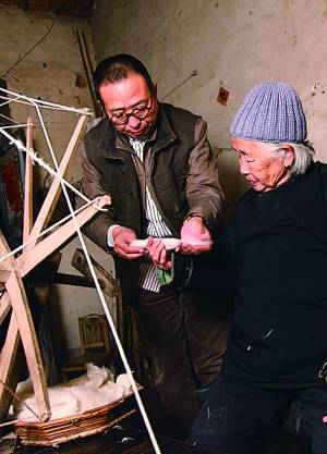 “每次到縣里、省里織布,嫂子都不敢一個人去,要讓我陪著才行,這次經理沒有讓其他人知道,直接讓我一個人來了。”來自山東省鄄城縣大埝鄉俊李莊的劉春英,一看就具有一種當地織布行家里手的模樣,在村里一定少不了經常有鄉親找她請教織布的難題。這次劉春英把嫂子家的織布機帶來進行現場表演。也許因為有著從小練就的織布技藝,在熙熙攘攘的觀眾面前她顯得鎮定自若,即使現場表演也如同在家里一樣一板一眼,游刃有余。說起每天手工織布的數量,按照她的能力每天能織至少十幾米。魯錦是一種純棉手工提花紡織品,早年在鄄城當地曾是家家戶戶所必需的手藝。女孩一到十幾歲便隨家里女性長輩學習織布,到了出嫁的年齡大都成了織錦能手。而在沒有化纖等面料出現之前,當地鄉村一家人的衣被等生活必需品都要靠女性勤勞的雙手來供應。當地有一個有意思的民間習俗,即在婚禮現場,村里的婦女會以審視女孩陪嫁織綿的數量和質量來判斷新娘的家教和人品。在一些人看來,魯錦有著迷人的重復、平行、連續、間隔、對比等抽象圖案,有點類似西方現代抽象主義畫作。但更重要的是一針一線都滲透著鄉村生活經驗,魯錦已經成為鄉村生活和生命的一部分。久之,這種技藝成了滲透進當地人骨子里的文化因子。也許正因如此,在那架原始、樸素和形式簡單的老織布機前,觀眾感到一種來自生活和民間藝術的震撼。一架織布機和幾個簡單的織布動作,使陌生的人群一下感到有些親切和一種來自鄉間的暖意,這就是來自民間藝術最樸素的魅力。