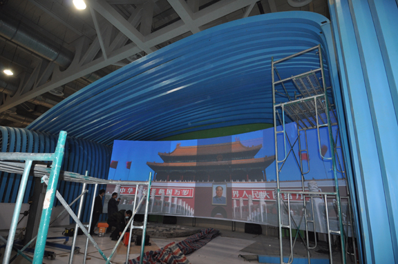 親自指揮下將全部安裝完畢,影院調試也已基本完畢。下午,主展廳影院將進行影片調試。