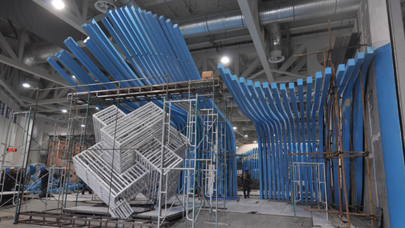 以及機器人外形設計張炎等老師一直堅守在北京,積極與北京水晶石有限公司、天圖設計公司進行協調溝通,密切合作。至此,山東館影片后期制作有條不紊,并已接近尾聲,展品展項已基本制作完成,并于今日到達現場進行安裝。