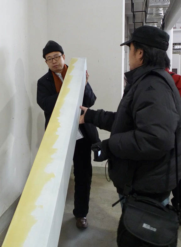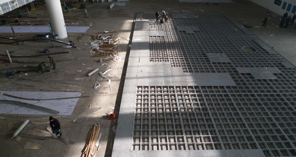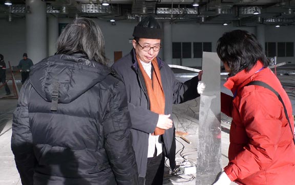 院長召開了現場工作協調會。潘院長首先代表學校對各單位的辛勤工作表示感謝,并指出:一,省委省政府高度重視世博會山東館的建設情況,1月15日在濟搭建完成是一項必須保質保量完成的重要的政治任務;二,山東館的外形藝術效果獨特,要在設計的基礎上,以雕塑的精細度在實施過程中以一貫之;三,地臺鋪設、綜合布線、照明效果、框架制作、施工監理等各個部分,要合理配合;四,框架結構、強弱電線路等工作,要以安全為第一要務。