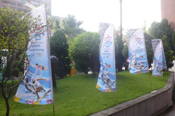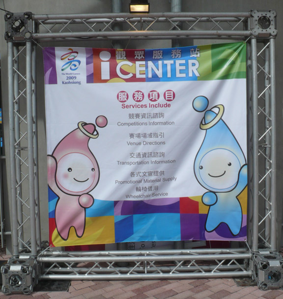 據人民日報社人民網報道,本屆世運會在景觀及視覺設計方面,注重節能環保,主場館采用太陽能發電系統設計建造,使用綠色能源,體現環保主題。吉祥物“水精靈”,以高雄市“光和水”兩大主題為靈感,在造型上以水滴形狀出現,以“高雄”兩字命名為“高妹”和“雄哥”,并運用太陽能發電,吉祥物頭部的小球吸收太陽能后,身體發光。會徽以高雄市的“高”字為主要元素,設計為彩帶形狀,呈現繽紛色彩和律動感覺,傳達和諧、友誼、律動、飛躍、進步、歡樂的概念。且彩帶狀的“高”字起頭為黃色系,結尾使用藍色系,表現高雄市是一座擁有陽光和海洋的城市。