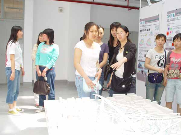 交流會在一種愉悅的氣氛下,采取互動的形式進行。低年級同學在參觀中細心學習,通過參觀發現自己專業上存在的不足,進而主動發問及時解決問題。一個個建筑模型,一件件設計精華,看到畢業生作品中巧妙的構思,合理的布局,再加上精細的做工,體現出的不僅僅是他們四年學業的碩果,更是他們嚴謹端正的態度和精益求精,追求完美的精神。在談到建筑與環境的結合時,一位畢業生代表指出:建筑不能孤立于環境之外,應該聯系環境,生存于環境之中,與環境融為一體。