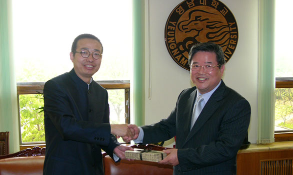 嶺南大學校長禹東琪先生在校長會議室愉快地會見了