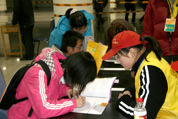 在報名區入口處,志愿者組的李志強正帶領干事們忙碌著,一方面組織考生排隊,一方面查看考生的報名表。該組宋華榮同學在接受采訪時深有感觸地說:“考生十分不易,一個月的時間內奔波于幾個城市之間,參加數場考試,只為圓自己的大學夢。我也是過來人,曾得到過我院服務生的幫助,體會到那種被人關心的溫暖。更何況在幾個月后,前來報名的考生很有可能成為我的校友,所以我想盡我所能把這種溫暖傳遞下去,多呵護他們一些,讓他們在求學路上走得更加順利?!?
