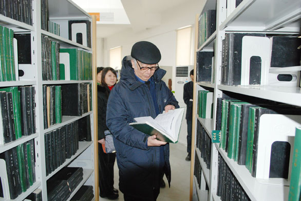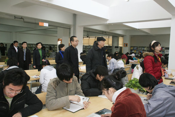 隨后,評估專家組成員先后考察了圖書館綜合書庫、中文閱覽室、樣本書閱覽室、外文閱覽室、專業書庫、電子閱覽室,聽取了相關人員對于圖書館館藏及使用情況的介紹。圖書館座椅由我校教師設計,充分考慮到了學生就坐閱讀的方便和舒適。在綜合書庫和外文閱覽室,楊永善教授坐在方凳上,說:“凳子坐上去也很舒服,圖書館讀書環境很好”。在外文閱覽室,評估專家認真翻閱了外文期刊,認為我校外文期刊數量充足,有利于學生了解前沿設計理念。