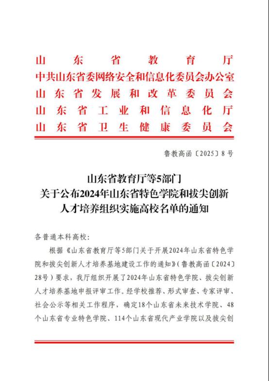 近日,山東省教育廳等5部門印發《關于公布2024年山東省特色學院和拔尖創新人才培養組織實施高校名單的通知》(魯教高函〔2025〕8號),我校工業設計特色學院入選山東省專業特色學院。人工智能創意產業學院、現代文創產業學院入選山東省現代產業學院,實現...